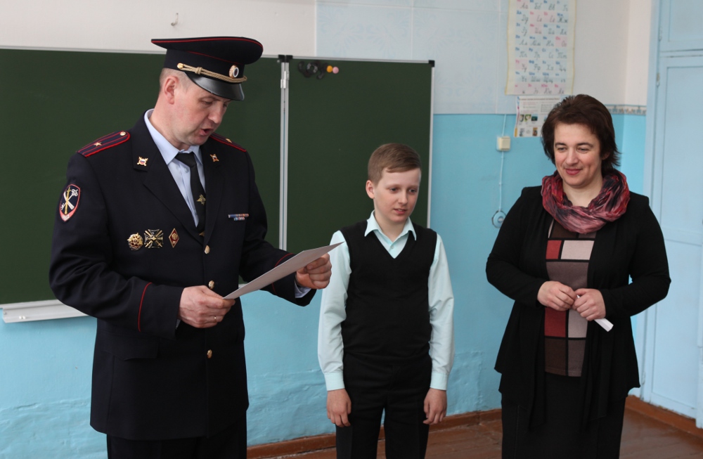 С благодарностью от отдела полиции и Общественного совета 10 мая в школу приехали Алексей Опарин, начальник группы кадров МО МВД России «Галичский», и Жанна Серогодская, редактор нашей газеты, член Общественного совета. Они поблагодарили ребят, вручили им Благодарственные письма и памятные подарки.