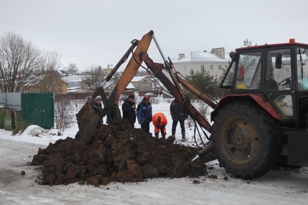 К 11 часам специалистам удалось найти место предполагаемого порыва. Поврежденная чугунная двухсотмиллиметровая труба находится ориентировочно на глубине 2,5 метра. Ситуацию усугубляет то, что она расположена под трубами системы отопления.