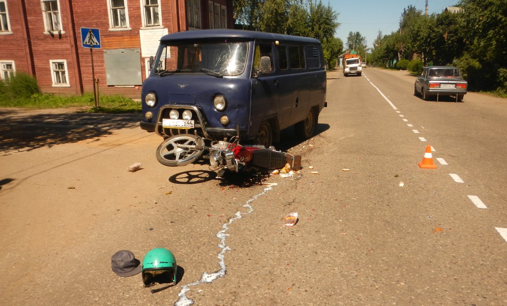 Авария произошла сегодня, 28 июня, в 12 часов 50 минут. Мужчина семидесяти пяти лет ехал на мотоцикле по улице Красноармейской и на перекрестке не уступил дорогу автомобилю УАЗ ("буханка"), двигавшемуся по улице Ленина – главной на этом перекрестке. Мотоциклист получил открытый перелом правой голени и открытую черепно-мозговую травму, от которой мужчину не уберег даже шлем, слетевший с его головы во время удара.
