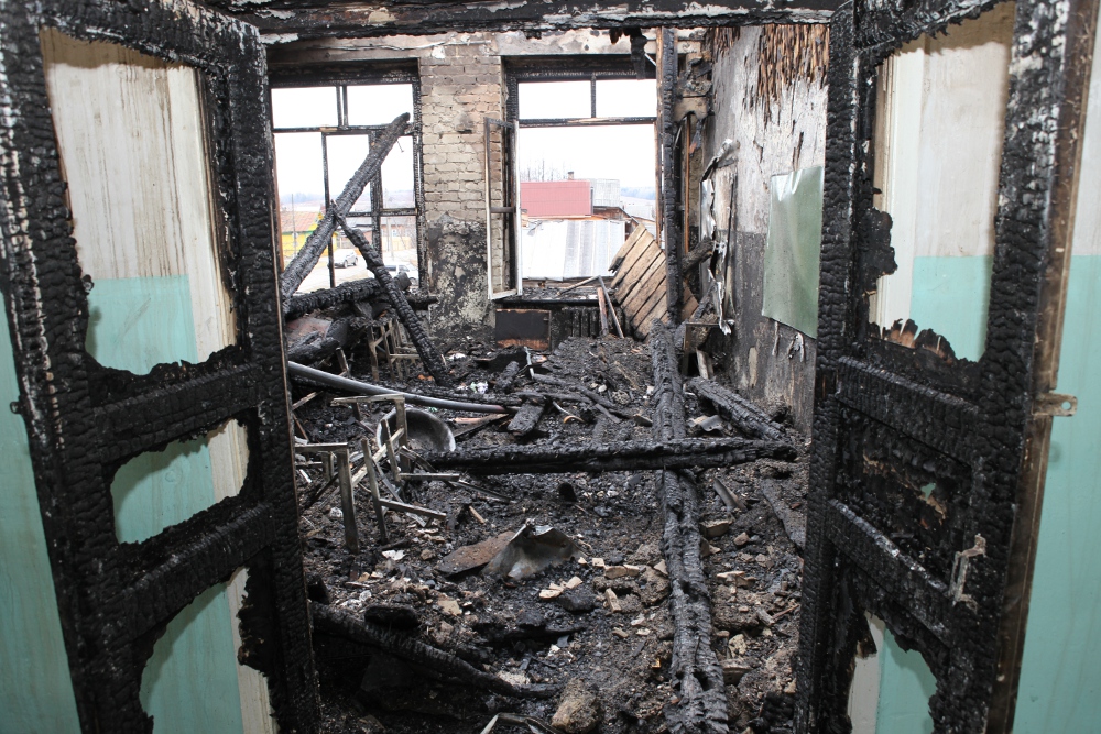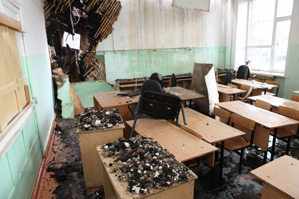 Пожар в школе №2 потушен полностью. Дознаватели ищут в обгоревшем здании причину возгорания, а учителя и старшеклассник спасают то, что вчера еще делало эти стены их родным домом — мебель, книги, цветы...