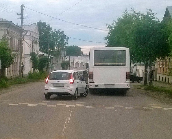 Водитель «Лады-Калины», житель города Галича, 1980 года рождения, водительский стаж которого более 12 лет, двигаясь по улице Свободы в направлении площади Революции, при проезде пешеходного перехода, оборудованного искусственной неровностью, не выдержал необходимую дистанцию до движущегося впереди автобуса маршрута №4, в результате совершил столкновение.