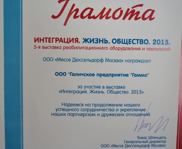 Учредитель и участник выставки в России - Общероссийская общественная организация инвалидов «Всероссийское Ордена Трудового Красного Знамени общество слепых». Член торгово-промышленной палаты ООО «Галичское предприятие Гамма» представило себя в Москве среди 29 предприятий-участников из разных уголков России.