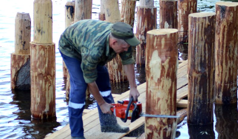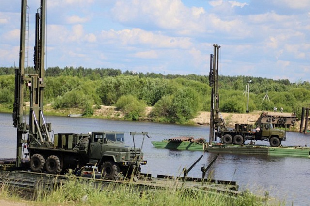 К возведению переправы бригады приступили в начале июня. В самой реке установлены понтоны для грузовой спецтехники. После разведывательных работ там начался этап забивки свай, на которых будут держаться перекрытия будущей переправы. Первые восемь береговых опор уже забиты. Предполагается, что завершено строительство будет к 20 июля.