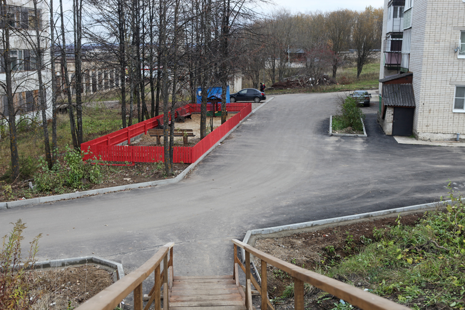 Привели в порядок придомовую территорию возле дома №17 на улице Пушкина: положили асфальт, установили бордюрные ограждения вдоль проезжей части, оградили придомовые клумбы, поставили парковые скамеечки.