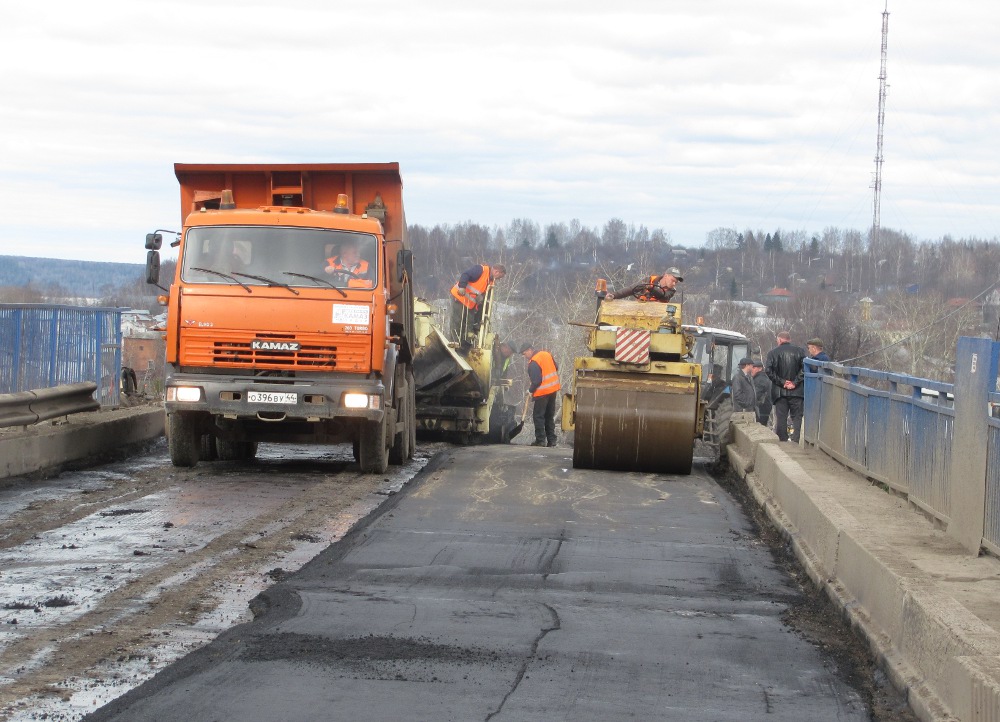 19 апреля ДЭП-10 приступил к восстановлению асфальтового покрытия. И это не ямочный ремонт! Днём раньше, соблюдая технологию снятия разрушенных слоёв, мост выровняли, применяя тяжёлую фрезу, специалисты Костромского ДЭПа.