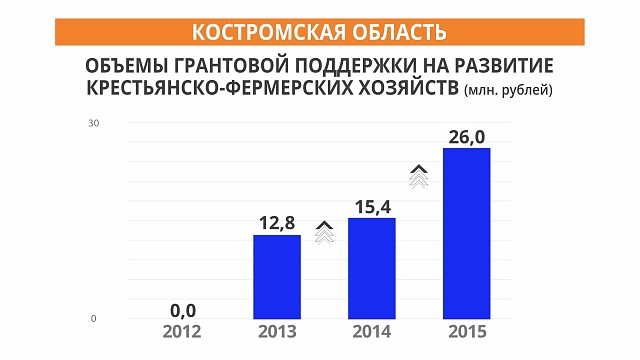 В Костромской области объемы грантовой поддержки на развитие крестьянско-фермерских хозяйств за последние три года увеличились в два с половиной раза. - В 2015 году грантовая поддержка КФХ района составила 1 миллион 65 тысяч в рублей. В 2014 году по Программе «Развитие семейных ферм» начинающим хозяйствам было выплачено -17 млн. рублей. На поддержку начинающих сельхозтоваропроизводителей область в этом году выделила из своего бюджета более 22,3 миллиона рублей.