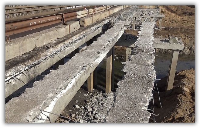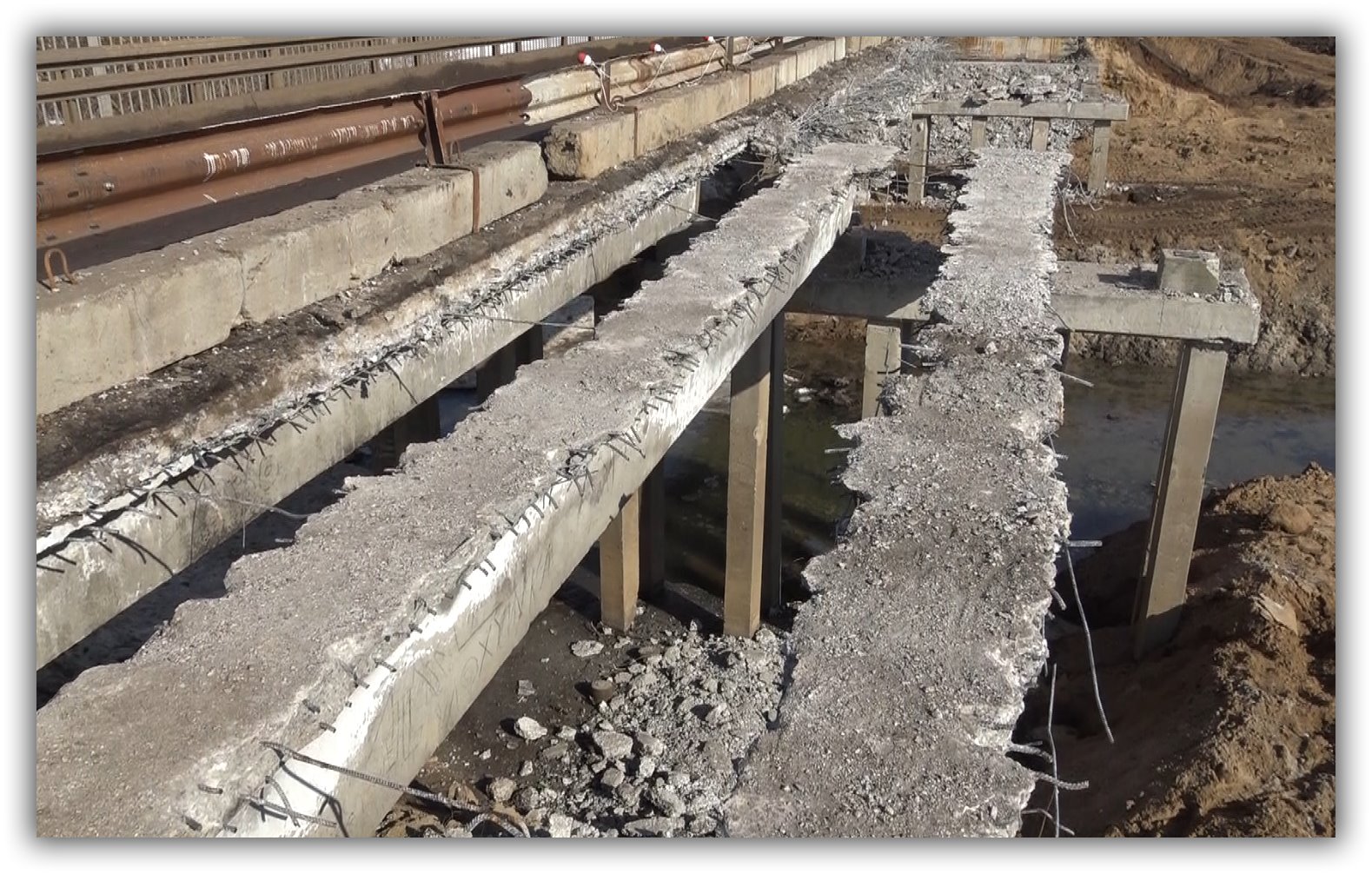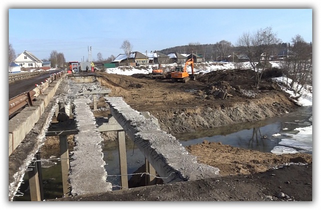 В настоящее время рабочие уже разобрали часть моста и забили сваи под основание подпорной стенки. После будет выполнена заливка конструкции бетоном.