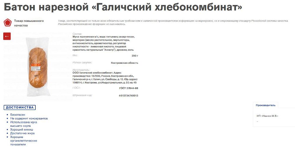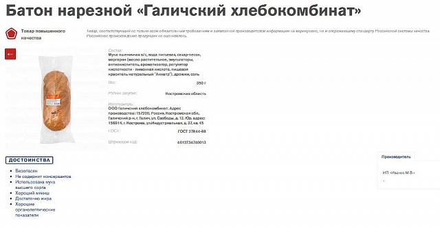 В числе закупленных батонов оказался и галичский. «О том, что хлеб нашего предприятия стал участником всероссийской проверки, мы не знали, - пояснила корреспондентам «Галичских известий» заведующая производством «Галичского хлебокомбината» Светлана Егорова. - Только недавно получили письмо из «Роскачества» с уведомлением, что наша продукция внесена в российский реестр качества и претендует на присвоение ему Российского знака качества».