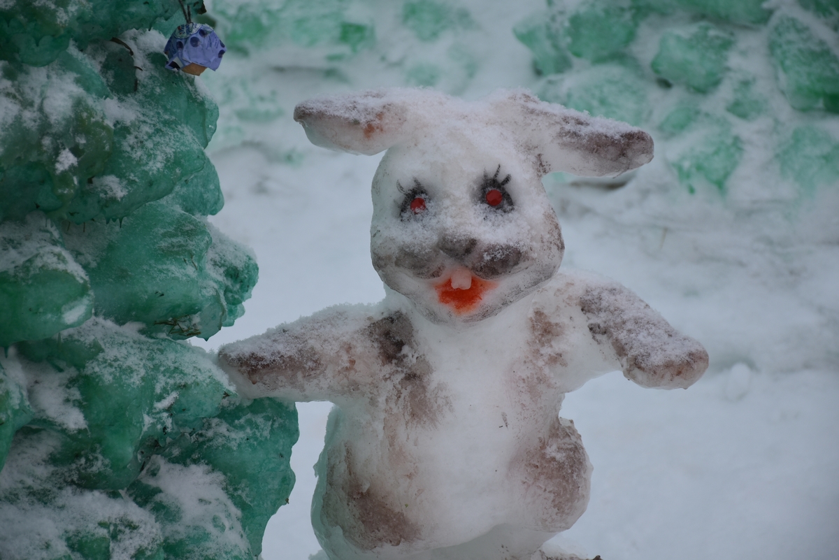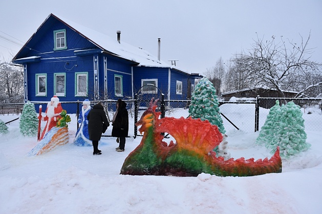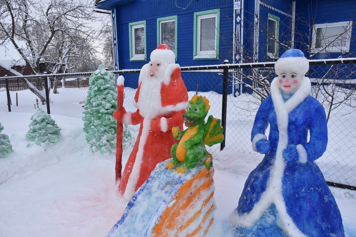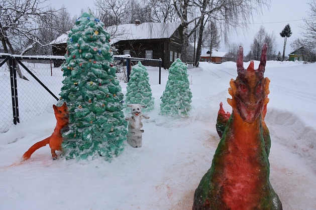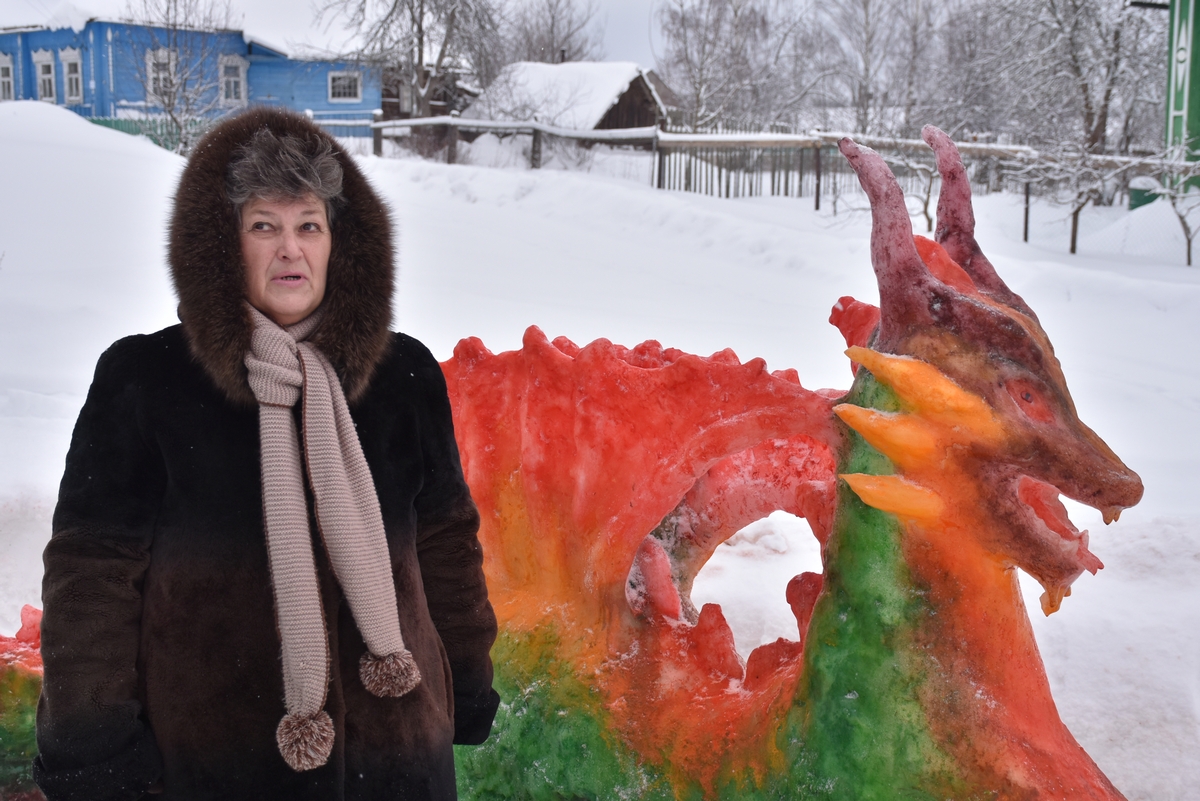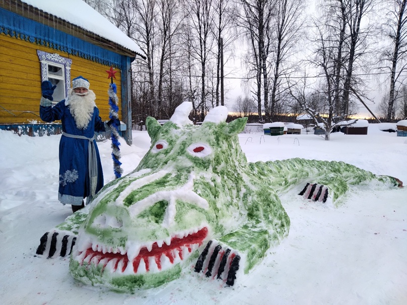 Отрадно, что и в других населенных пунктах нашего района жители не прочь порадовать односельчан своими снежными шедеврами, благо, что строительного материала для творчества нынче хоть отбавляй. Жители деревни Левково, Елена и Валерий Смирновы, символ года изобразили в натуральную величину, сказочное чудовище поражает своими габаритами и грозным оскалом, оно надежно охраняет хозяйское жилище от недобрых людей и дурного глаза.