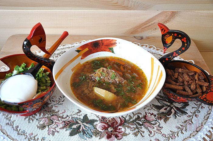 Сами представьте: бульон из нескольких сортов мяса, в том числе - лесного, перловка, сушеные белые грибы... А к горячим, наваристым щам - еще и румяные пирожки с капустой, и голубцы сытные, и соляночка, и квашеная капуста из кадушки... Ммм, пальчики оближешь!