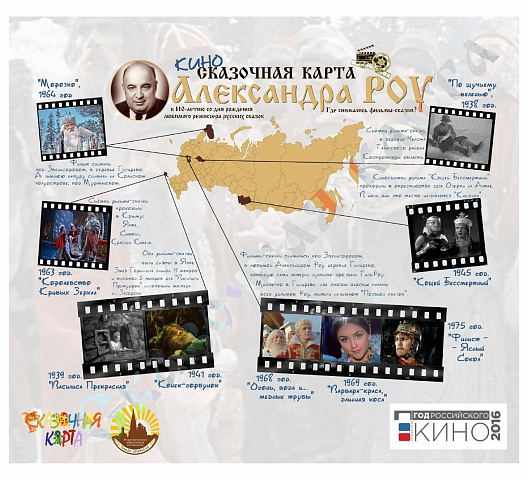 Культурно-туристический проект, приуроченный к начавшемуся в России году кино, объединит информацию о местах, где в разное время снимались любимые и взрослыми, и детьми киносказки. На карту, которая будет готова к 8 марта 2016 года - дню 110-летия великого советского киносказочника Александра Роу – попадет Костромская область – родина Снегурочки. С ней на необычной карте будут соседствовать Московская область, Алтайский край, полуостров Крым, Кольский полуостров, Пермский край и многие другие регионы России, где режиссеры-сказочники снимали любимые многими поколениями россиян фильмы по мотивам русских сказок.