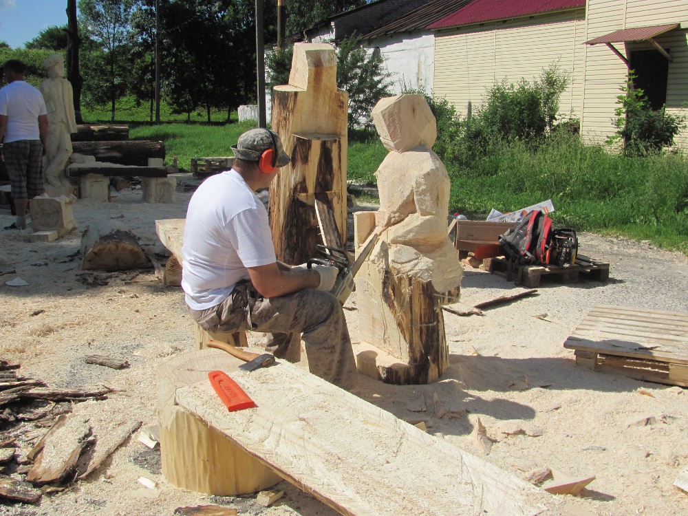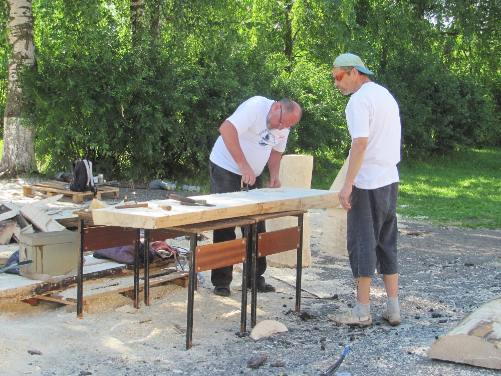 С раннего утра среды мастера приступили к работе: раскряжевали бревна в размер будущих скульптур, окорили. К полудню в едва намеченных очертаниях уже угадывались конкретные композиции: два невысоких чурбачка по краям деревянного полотна – Маша и дальний родственник Медведя, Панда, тянут каждый на себя пыльное покрывало – сидение будущей скамьи. Высокие чурбаки - индеец и ковбой увлеченно смотрят на «волшебный» экран синематографа. Чурбачки со спинками и прорисованными маркером гнутыми ножками – ясно, три ореховых стула из семейного гарнитура воробьяниновской тещи, только на этот раз работу мастера Гамса попытаются повторить (а, может, и превзойти) макарьевские мастера Александр Смирнов и Михаил Тетерев.
