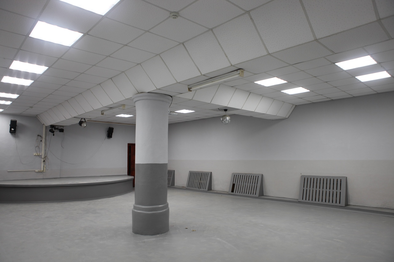 Ремонт затронул несколько помещений центра. В основном большом зале проводятся дискотеки, рок-концерты, различные встречи. Здесь собираются ветераны, работают избирательные комиссии, стоят столы для тенниса и шахмат, спортивные тренажеры. Рабочие покрасили здесь пол и стены, заменили потолочные панели и поменяли светильники на новые экономичные - светодиодные. В этом помещении нет окон, но благодаря правильному подбору цвета для внутренней отделки оно стало светлее, уютнее и зрительно еще больше. В концертном зале, где проводятся общие собрания жителей Шокши, детские выступления, показы кинофильмов, обновили цвет сцены, пола и стен.