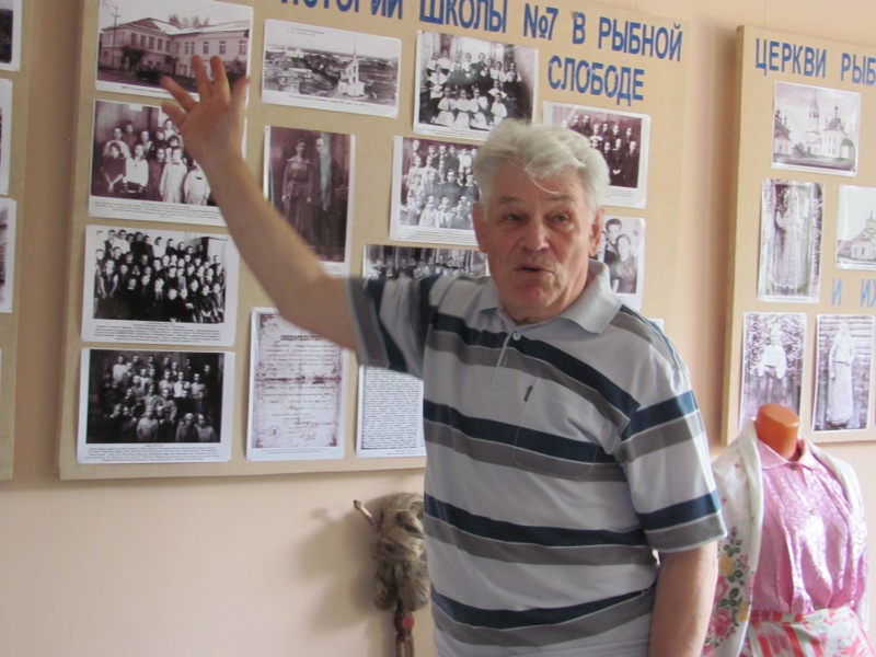 Экскурсия по залам привела читателей на краеведческую выставку, которую представил местный краевед Николай Васильевич Сотников. Он рассказал о том, как начиналась Рыбная Слобода, об ее жителях, об истории школы № 7, которая там находится. Уголок с предметами быта, фотографиями на стендах вызвал интерес тех, кто впервые вошел в этот зал.