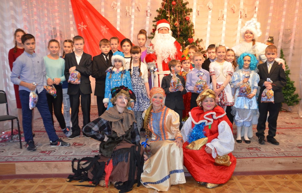 Сотрудники учреждения культуры подготовили для ребят костюмированное представление «Новогодний ералаш» с любимыми сказочными персонажами: Дедом Морозом (В. Вершков) и Снегурочкой (И. Голубева), Василисой Премудрой (Ю. Семёнова), Мешочком Радости (Л. Лебедева), и Царём Горохом (А. Волкова). Не забыли и про вездесущую Бабу Ягу (С. Соловьёва) и её вредную дочку Ёжку (Е. Бревнова), которые в течение всего спектакля хотели испортить всем праздник, используя для этого волшебные премудрости и коварное колдовство.