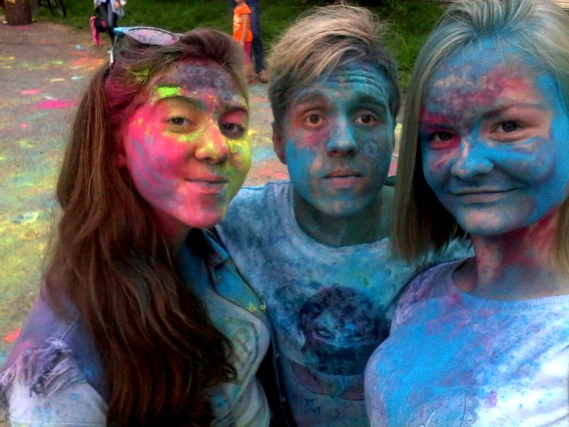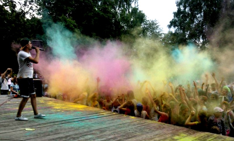 Всеобщему безумному веселью не помешали ни серые тучи на небе, ни скучный дождик, что принялся лить под вечер: всю серость закрасила разноцветная пыль, которой бросались, обсыпались и мазались десятки галичан на площадке перед сценой в городском парке.