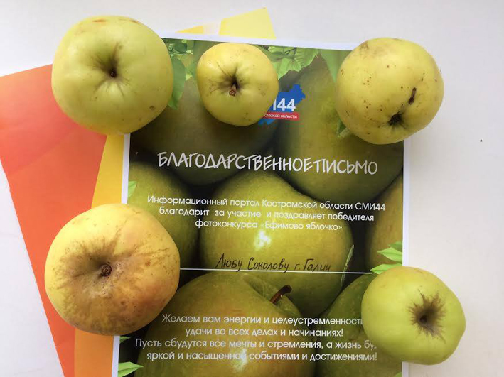 Хотя сама Люба Соколова на финале в Костроме не присутствовала, о ее щедром яблоке финалисты узнали: шеф-редактор областного информресурса Анастасия Фишер подвела итоги заочного этапа конкурса и показала призы, которые уже отправились в Галич. Диплом победителя и эксклюзивную книгу-разукрашку Любаша совсем скоро получит в редакции «Галичских известий».