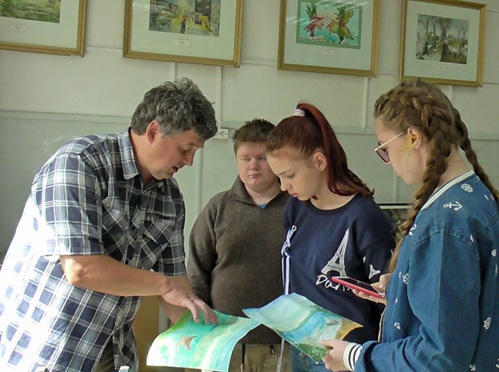 Ребята смело взялись за кисти, ведь и как педагог Игорь Валентинович оказался на самом высоком уровне - он терпеливо объяснял, показывал, был открыт для общения и с радостью откликался на успехи уже своих учеников. Вместе с ребятами художник написал пейзаж - вид родного Галичского озера.