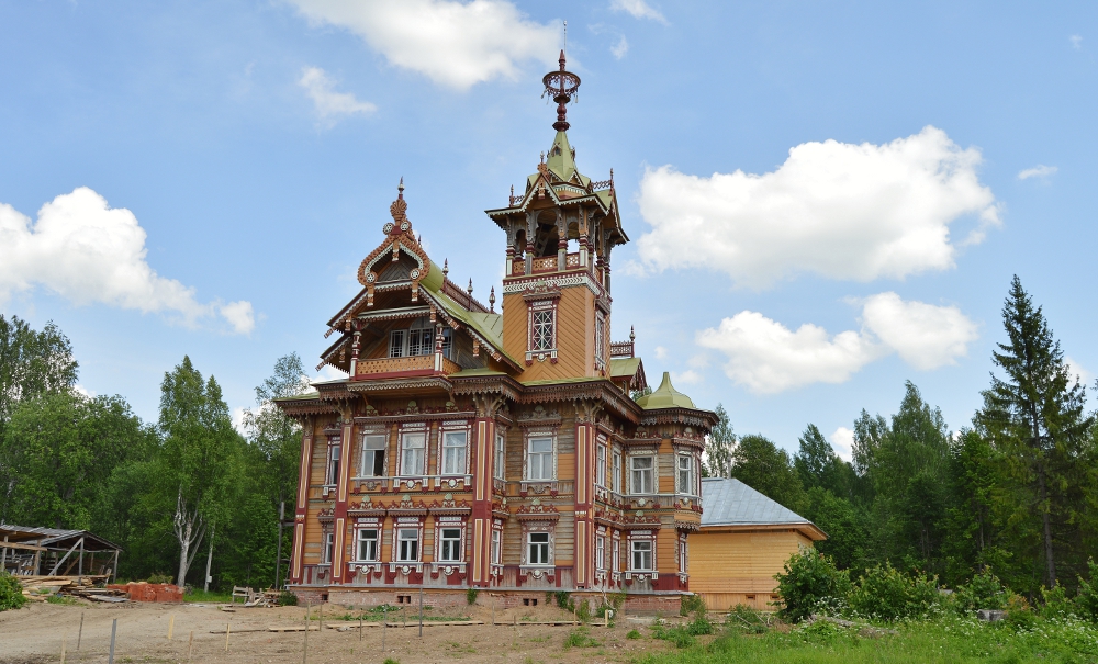 На рубеже 19 и 20 веков ее построил чухломский крестьянин-отходник, мастер-краснодеревщик Мартьян Сазонов, а спустя сотню лет московский предприниматель, увлеченный путешественник Андрей Павличенков дал удивительному терему, обреченному на неминуемую гибель в лесной глуши, вторую жизнь. Перебранный буквально по бревнышку, сейчас терем реставрируется изнутри и готовится стать музейно-культурным центром с гостиничным комплексом, на базе которого будут организованы туристические программы краеведческого и активного отдыха.