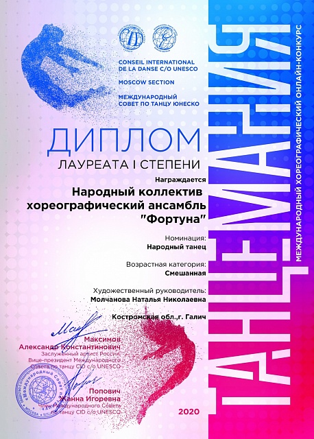 Хореографический ансамбль «Фортуна» стал обладателем Диплома Лауреата I степени заочного отборочного тура Международного конкурса «Танцемания». Участниками творческого состязания стали полторы тысячи конкурсантов.