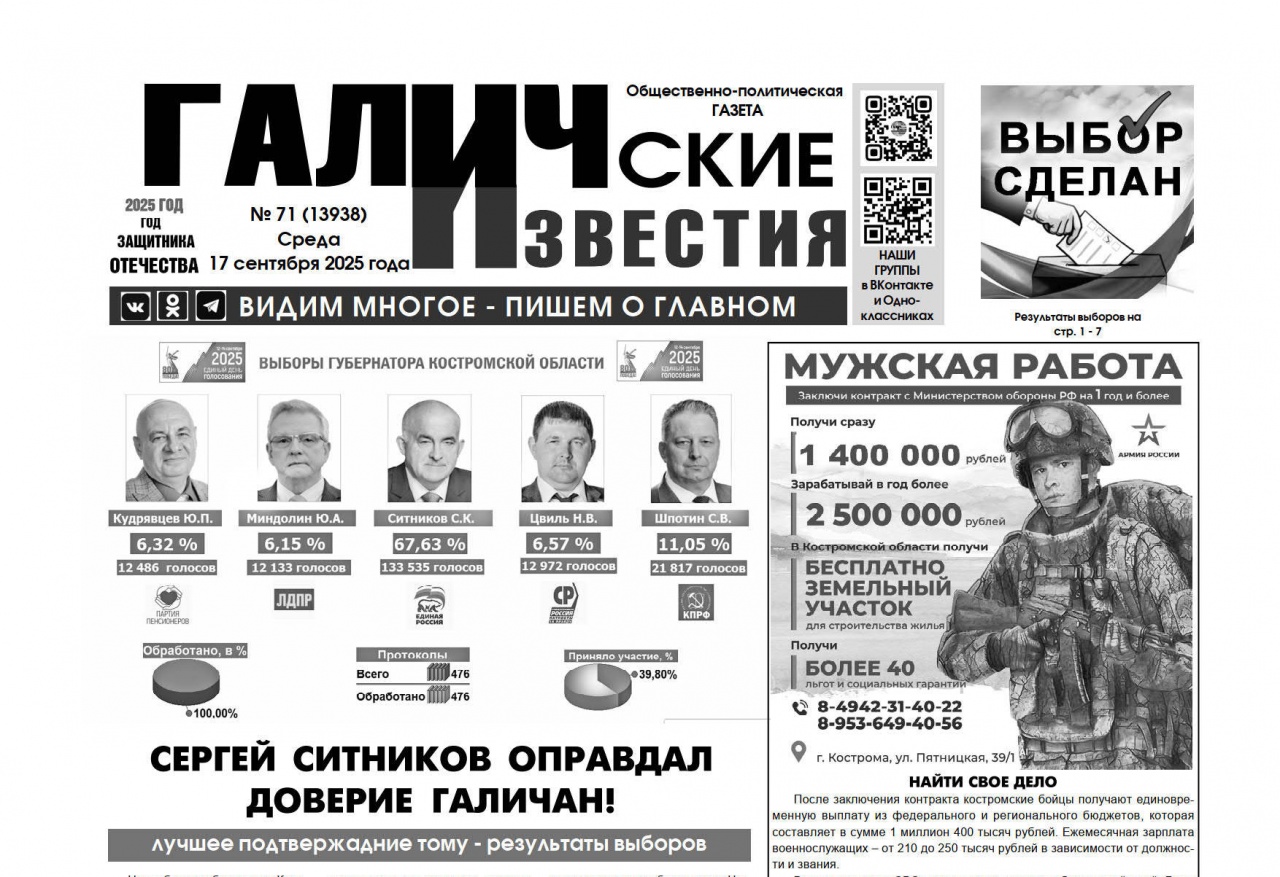 17 сентября 2025 года вышел № 71 газеты «Галичские известия»
