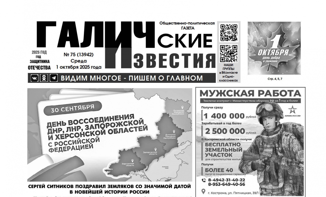 1октября 2025 года вышел № 75 газеты «Галичские известия»