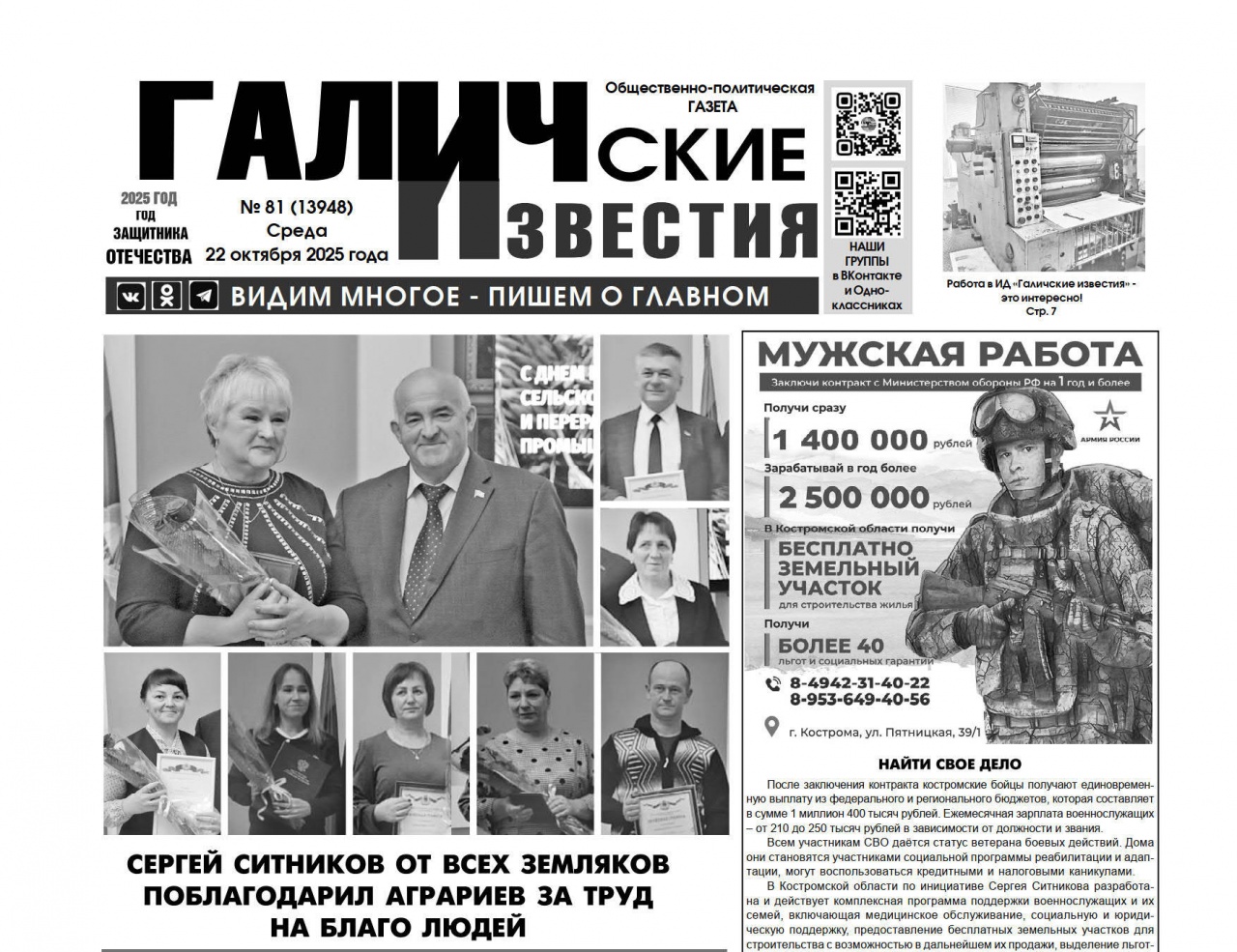 22 октября 2025 года вышел № 81 газеты «Галичские известия»