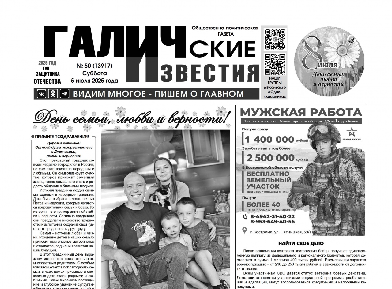 5 июля выйдет очередной номер (№ 50) газеты «Галичские известия». Что интересного? Читайте в этом номере газеты: День семьи, любви и верности! Стр. 1.