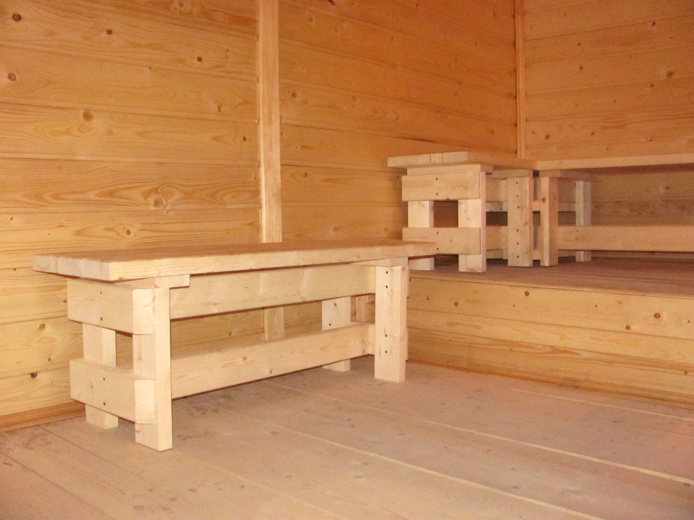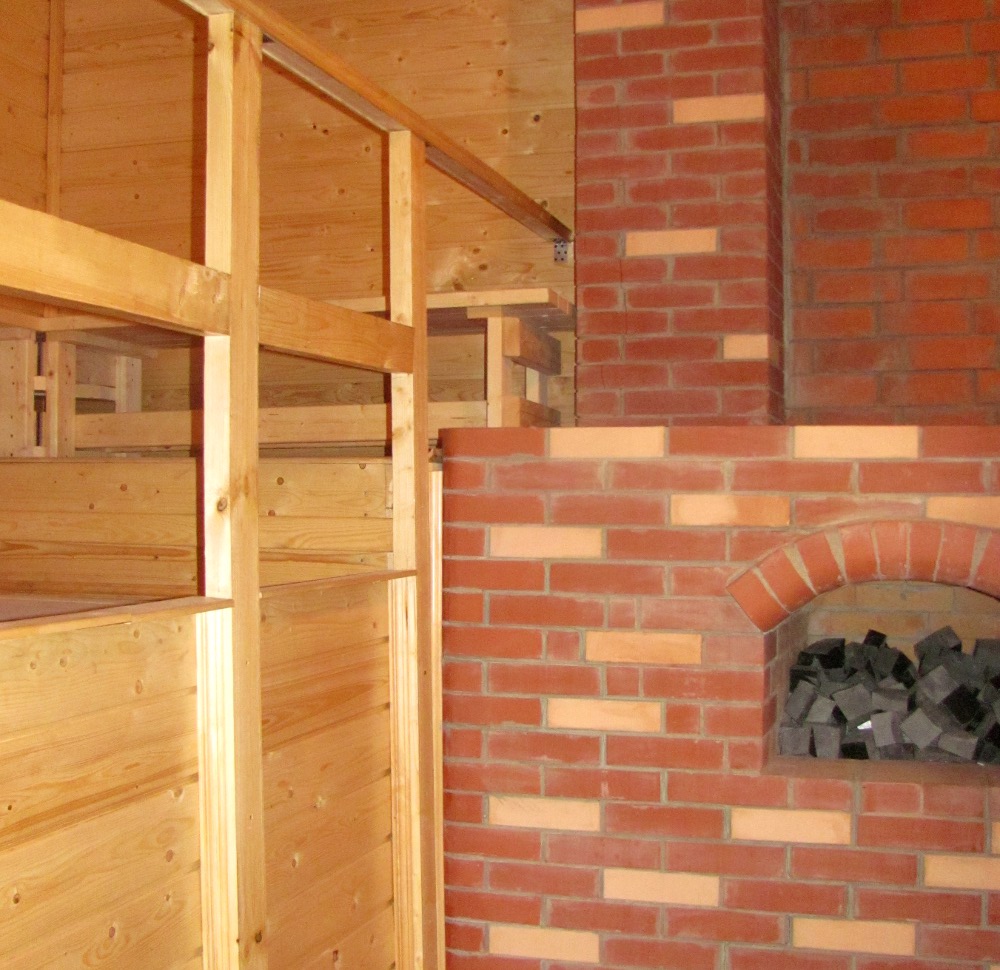 Оно использовано и для изготовления дверей, отделки дверных проёмов, полностью - парилки. А какая там печь! Сложена по всем правилам, правда, и стоит недёшево. Помывочное отделение отделали новой плиткой. Новый пол в раздевалке.