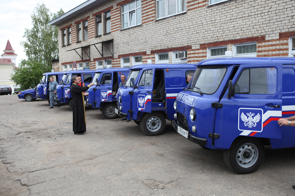 Шесть новеньких УАЗов и одна грузовая красавица-японка HINO (которую водители тут же «окрестили» на наш манер - Ниной) заменили отслужившие свой срок почтовые машины. «Весь наш парк – 16 автомобилей высокой проходимости отечественных марок УАЗ и ГАЗель. Новую технику в последний раз получали несколько лет назад: одну машину – в 2010-м и еще две – в 2011-м. А уж такого большого поступления в Галиче не было за все время существования почтового гаража, - не скрывает радости руководитель почтамта Максим Скориков. – Поэтому и было решено по старинному русскому обычаю освятить новые автомобили, а вместе с ними и те, что стоят уже на службе несколько лет. Получить благословение на работу в пути предложил механик Галичского почтамта Юрий Константинович Кустов. Его идею поддержали все».