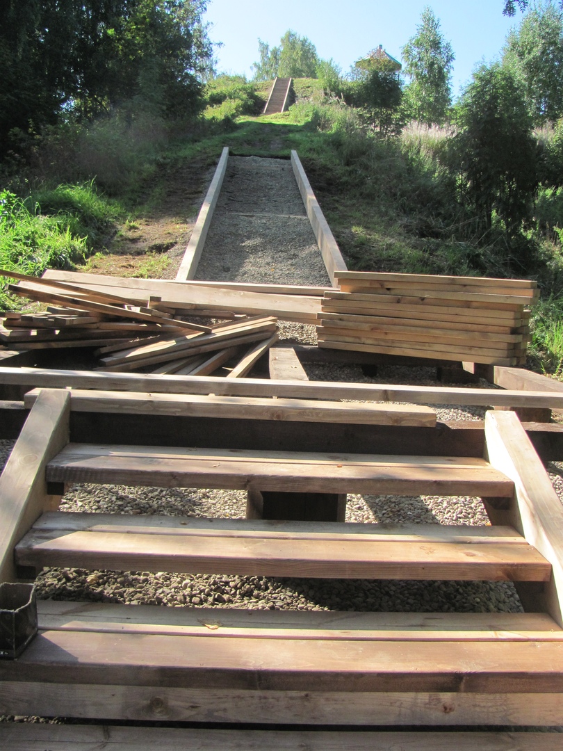 Старый подъем уже полностью демонтирован, в верхней части горы появились два новых лестничных марша. «Проект лестницы прошел согласование с инспекцией по охране объектов культурного наследия и обязательную процедуру. Мы получили согласие на оборудование подъема только в деревянном исполнении, с глубиной земляных работ не более десяти сантиметров. Конструктивно новая лесенка будет отличаться от прежней: ступени будут лежать не на земле, как раньше, а на специальной подложке из геосетки и щебенки, насыпанной на укрепленное основание. Эта конструкция обеспечит гидроизоляцию настила, поможет уберечь деревянные ступени от гниения», - рассказал начальник городской «Службы заказчика» Валерий Бобров.
