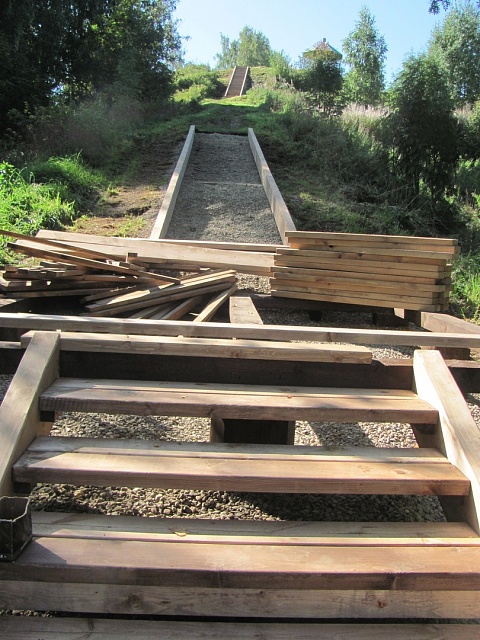 Кроме ступенек подъем будет оборудован перилами. На трех площадках установят скамеечки для отдыха, ведь преодолеть более шестидесяти метров подъема без передышки сможет далеко не каждый. Появилась новая лесенка и на склоне другой знаменитой галичской возвышенности - городских валов. Мы уже писали о том, что лестницы на старинные фортификационные сооружения взялись отремонтировать предприниматели, работающие в лесной отрасли. Первым к выполнению взятой на себя части работ начал предприниматель Алексей Корсун. Рабочие его компании уже оборудовали лестницу с перилами на южной части валов- напротив городского парка. Сейчас работы там продолжаются: лесенка спустится от тротуара до подножия насыпного холма.