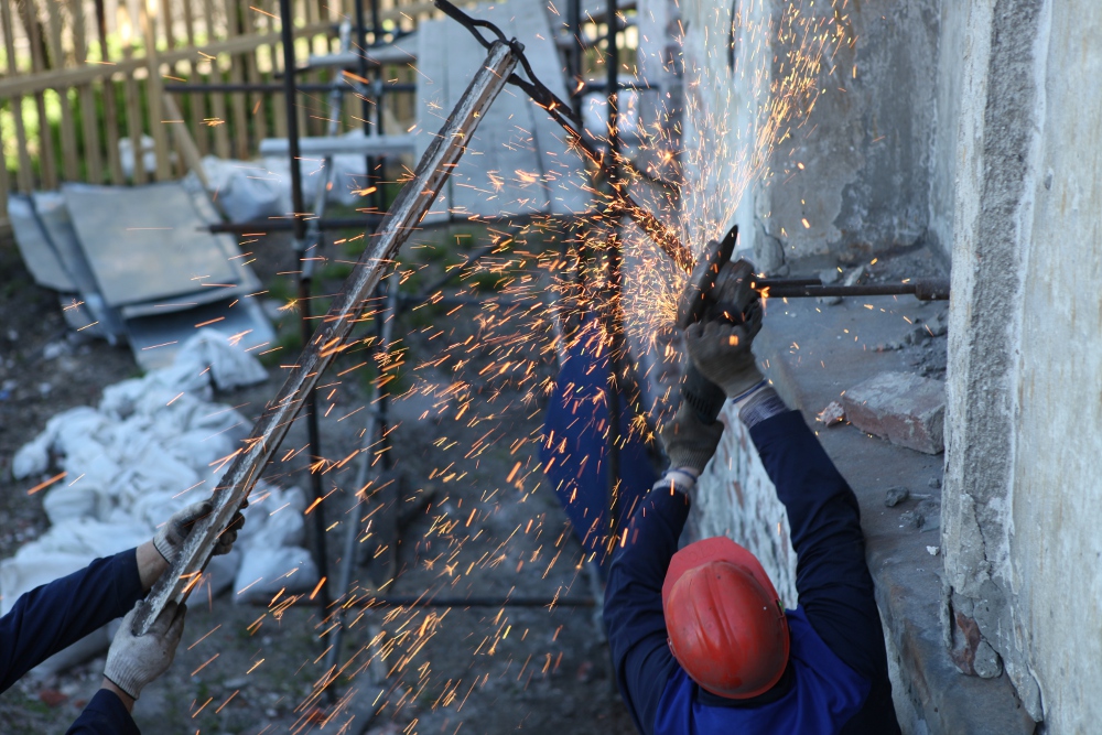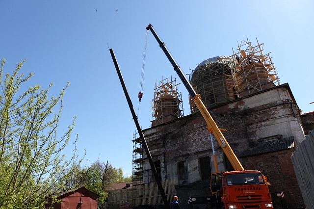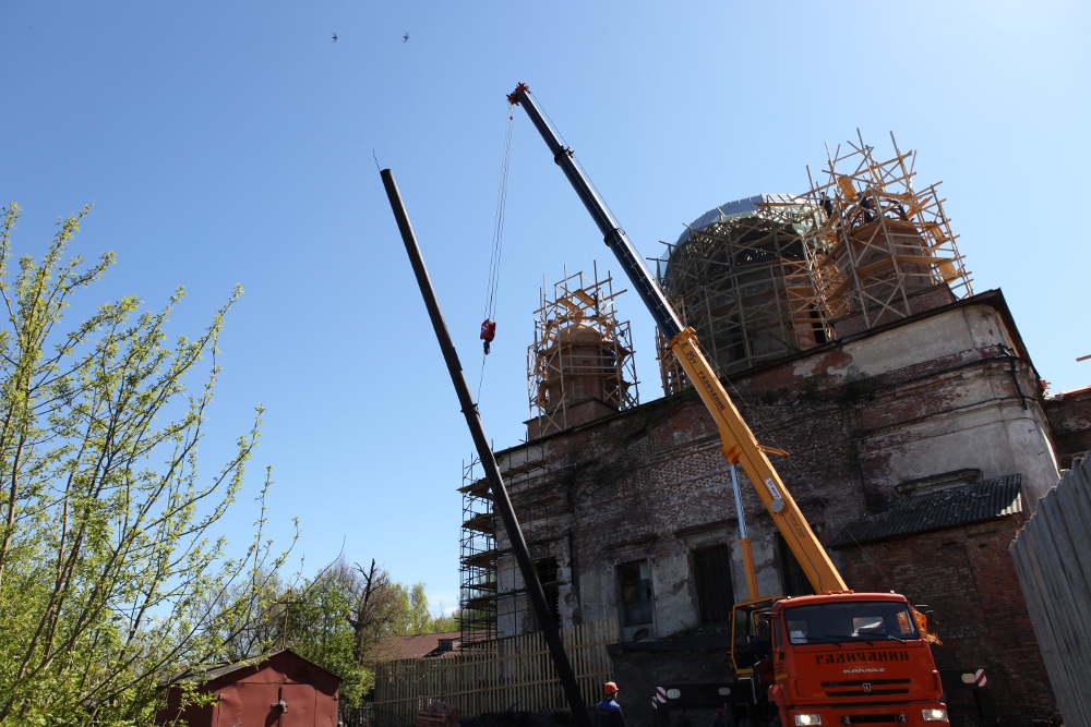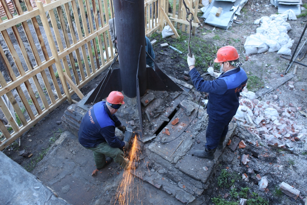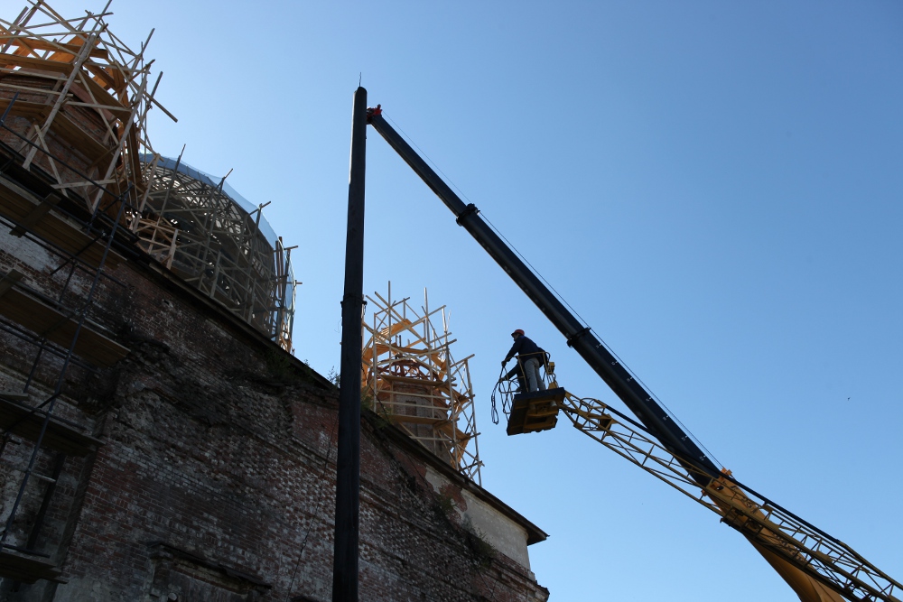 Отключение и разбор оборудования котельной начались в первых числах мая - сразу, как только был закончен отопительный сезон. Часть его находилась в пристройке, примыкавшей к западной стене здания, другая - в помещении самого храма. Это не позволяло подрядчикам вести наружные отделочные работы и закончить установку перекрытий между цокольным этажом и главным пространством по всей площади храма. Сейчас работы развернулись полным ходом: внутри храма, на стенах и на кровле.