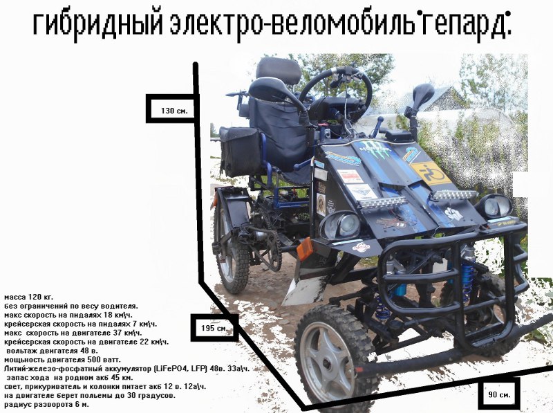 "Идея создания гибридного электро-веломобиля "Гепард" возникла в моей голове, когда встала острая необходимость преодолевать крутые подъемы и бездорожье. Тогда я уже знал, что перееду жить в загородный дом и на обычном веломобиле мне не преодолеть затяжной подъем на пути к дому. Перспектива же кататься по только деревне, мне, привыкшему к долгим путешествиям, совсем не нравилась. Нашел в интернете подходящий вариант двигателя для будущего транспорта - электрический бесколлекторный двигатель - спроектировал то, что мне нужно было, четко представив себе все узлы и запчасти, которые будут в ней использоваться. Нашел отличных помощников-мастеров «Русской ковки» Ивана и Илью Никитиных. Очень благодарен ребятам: они помогали мне в свое личное время. И спустя несколько месяцев я уже обкатывал свой «Гепард». Отличная машина получилась! Я знаю, что не одинок в стремлении путешествовать и своим примером решил показать, что для людей с ограниченными возможностями, которые любят дорогу, нет ничего невозможного».
