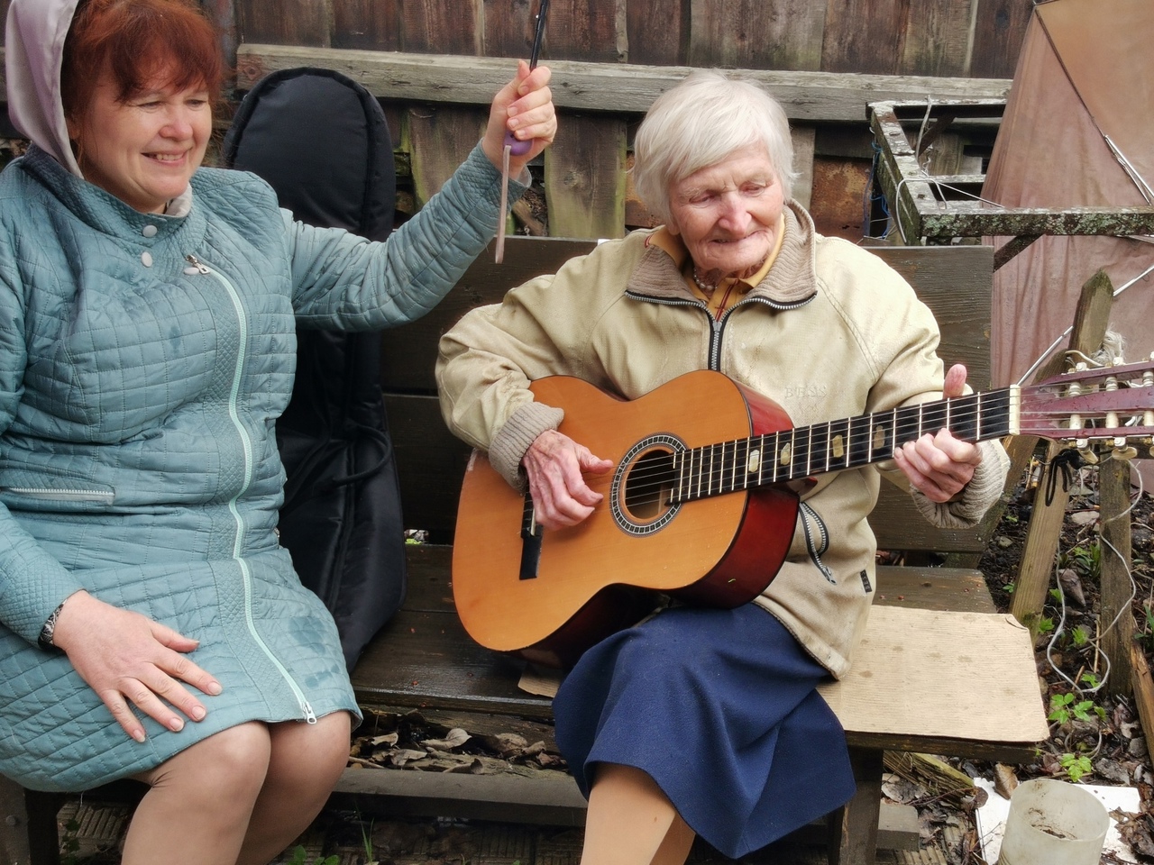 Другой ветеран, 99-летняя Антонина Николаевна Лебедева, сама вышла к артистам во двор и пела вместе с ними, а потом попросила у музыкантов гитару. Она сказала, что в юности сама немного играла, и, взяв инструмент в руки, под восторженные аплодисменты музыкантов, сыграла несколько аккордов. Не стареют душой ветераны!
