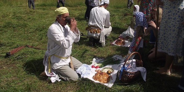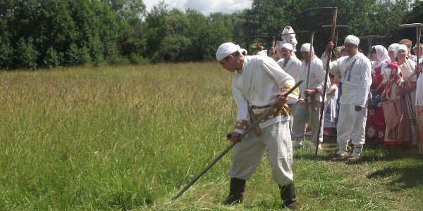 После представления на лугу разыгрывается один из самых красивых обрядов – благословение косцов. По стариной традиции мужчин на сенокос благословляли женщины. Косари повязывали на женщинах косынки, а те угощали их хлебом-солью да квасом, перепоясывали цветным рушником и говорили слово напутственное. После таких проводов за дело можно было приниматься «с русским размахом» — именно так назывался самый главный конкурс всего праздника.