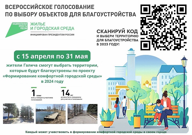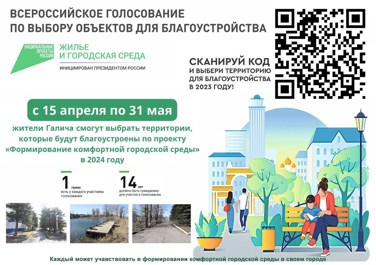 С 15 апреля по 31 мая 2023 года на платформе 44.gorodsreda у каждого жителя нашей области есть возможность принять участие во Всероссийском онлайн-голосовании за новые объекты благоустройства.