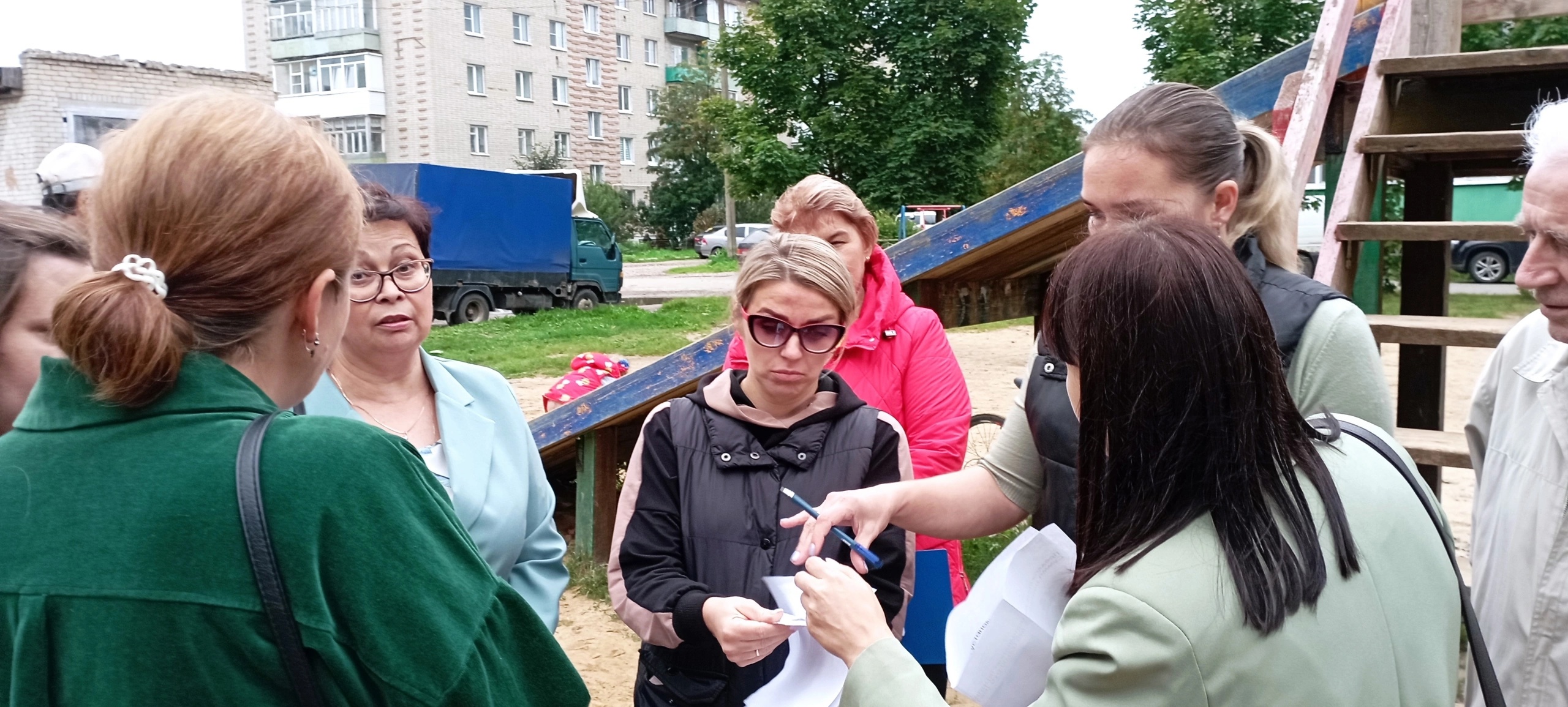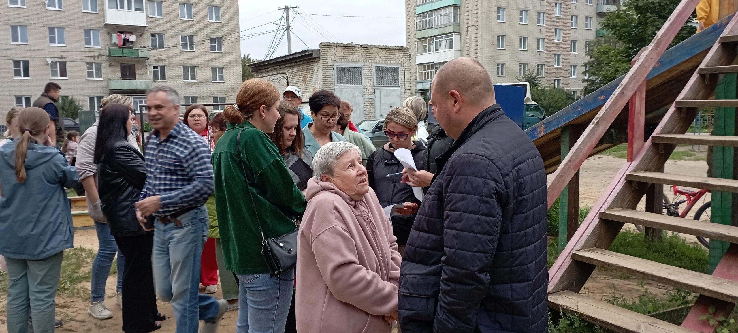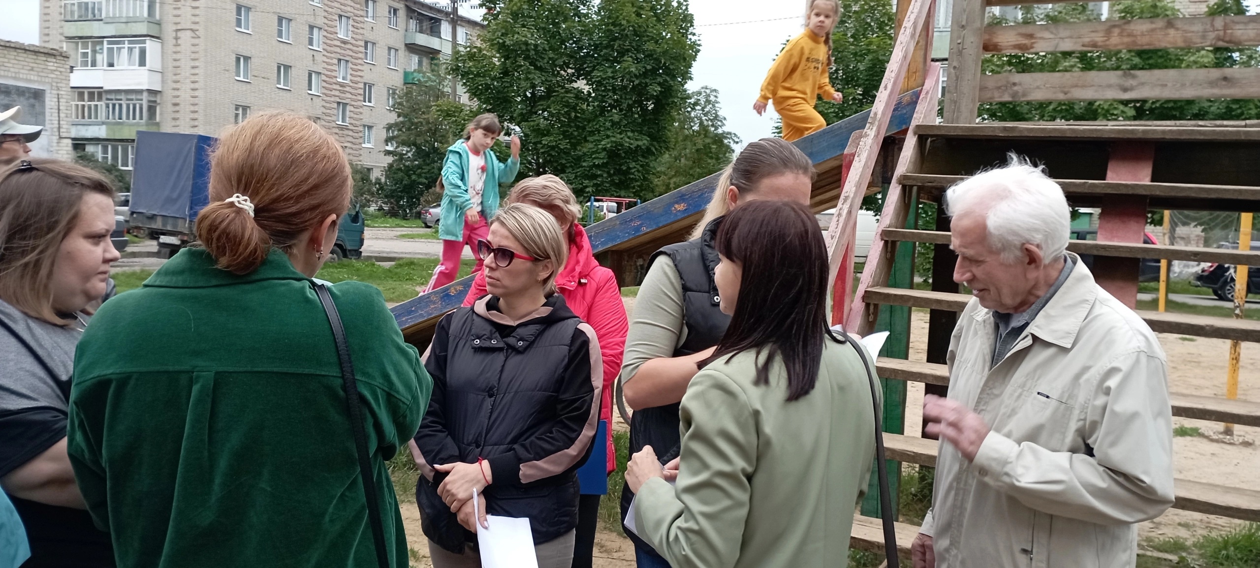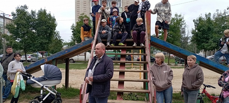 С инициативой размещения большой современной детской площадки между домом №18 по улице Лермонтова и домом №27 по улице Калинина выступили жители. Двор создают несколько многоквартирных домов, в которых живут молодые родители с маленькими детьми, семьи с детьми-школьниками, бабушки и дедушки, к которым приезжают погостить внуки. Днем площадка у домов наполняется детскими голосами, но играть ребятне негде - маленькие железные качели уже устарели.В среду на территории сегодняшней детской площадки глава города Галича Алексей Карамышев встретился с инициативной группой и активными жителями домов. Детвора, в ожидании решения родителей об участии в программе, словно слетевшиеся стрижи, заняли самую выгодную позицию – верхние ступеньки и площадку единственного объекта для развлечений – деревянной горки.