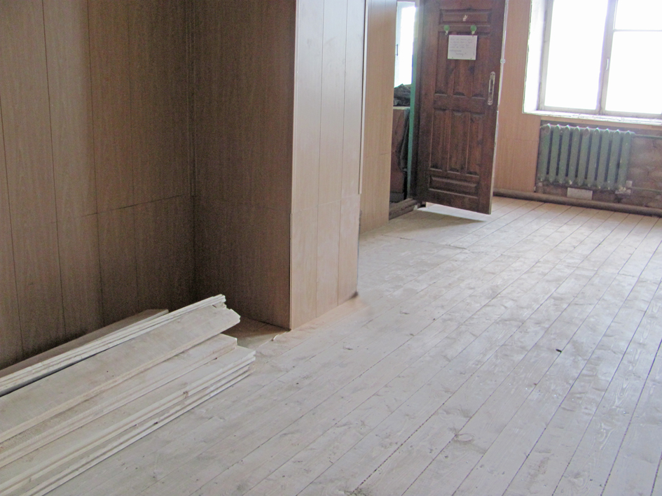 В раздевалке уложен новый деревянный пол, стены обшиты панелями, подготовлены к шпаклёвке и покраске лавочки.