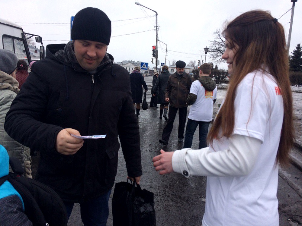Ребята вручали галичанам информационные листовки, рассказывающие о событии трехлетней давности: 18 марта 2014 году Крым (это территории полуострова Крым с расположенными на ней Республикой Крым и городом Севастополем, которые до этого входили в состав Украины) официально вошёл в состав Российской Федерации.