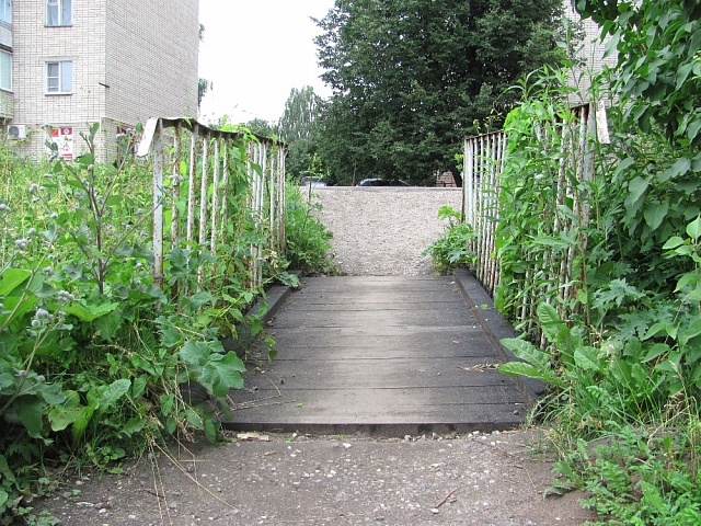Переправа через придорожную канавку нынешним летом совсем «прохудилась»: металлическая основа мостика стоит прочно, а вот деревянный настил сгнил. У дерева запас прочности меньше, да и «проходимость» у мостика большая: не через деревенский ручей перекинут - «берега» большого жилого микрорайона соединяет.