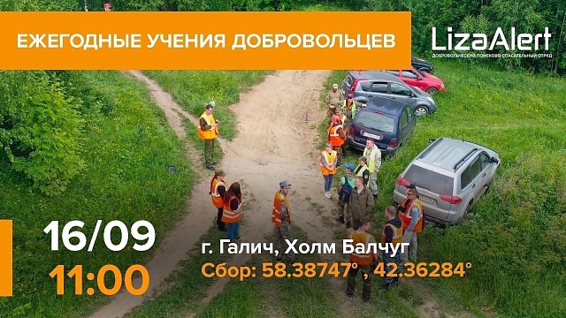 16 сентября, в субботу, на холме Балчуг, пройдут ежегодные учения добровольцев поисково-спасательного отряда "ЛизаАлерт" из Галичского района совместно со структурами: ОГБУ "Служба спасения, ГО И ЧС", ПСО №4 г. Галич, МО МВД России "Галичский".