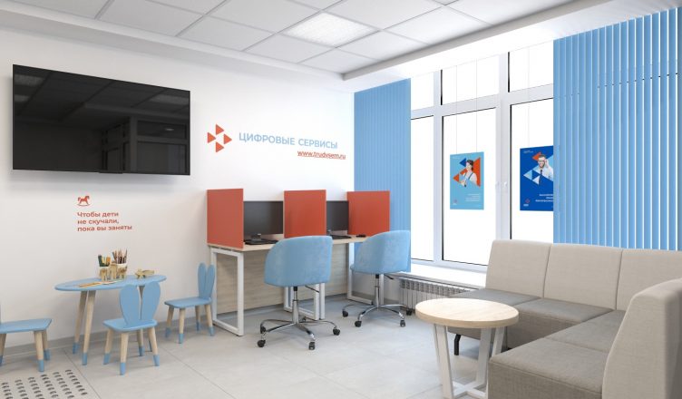 В помещении есть компьютерная зона для использования цифровых сервисов, отдельные залы для тренингов и встреч с психологом и даже игровая для детей, чтобы молодые мамы могли спокойно общаться со специалистами.