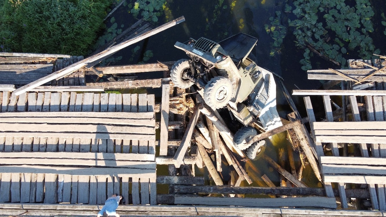 Грузовик, ставший виновником происшествия, сегодня извлечен из пролома в деревянном настиле моста. Фото поврежденного моста предоставлены газете "Галичские известия" одним из местных жителей.