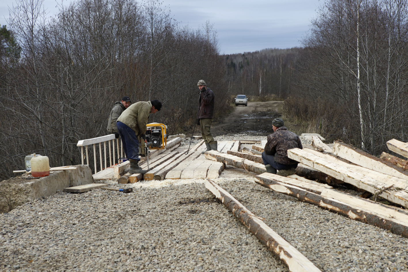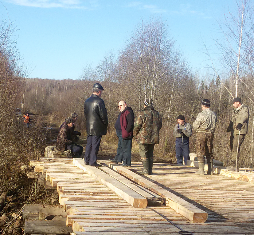В двадцатых числах октября возле «худого» моста деловито зарычала техника, завизжали бензопилы, застучали топоры. За четыре дня бригада в составе тракториста Николая Смирнова, водителя манипулятора Александра Цветкова и строителей Игоря Иванова, Константина Иванова, Ивана Яблокова и Ильи Титова привела в порядок переправу, отслужившую свое.