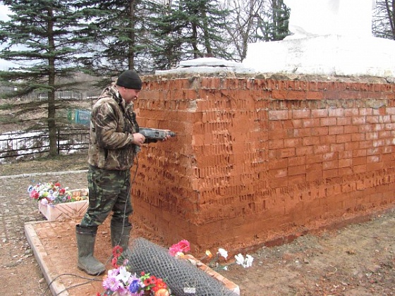 Если раньше постамент памятника аккуратно штукатурили, восстанавливая первоначальную форму, и на нем отдельно крепились таблички с именами умерших, то сейчас принято решение полностью отделать постамент плиткой в тон Георгиевской ленточки, а имена вынести на отдельные плиты в мраморном исполнении.