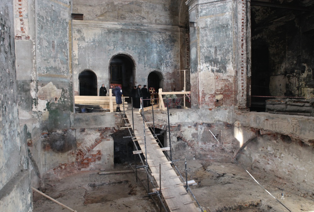 Сейчас вокруг собора установлены строительные леса и ведутся работы по выемке и демонтажу новодельных конструкций, нарушавших исторический облик собора и препятствующих началу реставрационных работ.