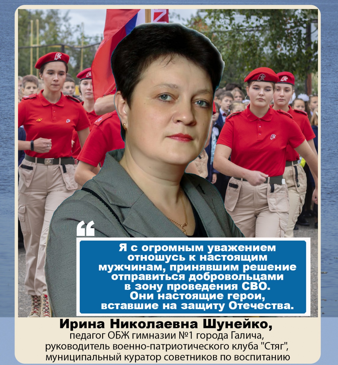 Говорят наши земляки – Ирина Николаевна Шунейко, педагог ОБЖ гимназии №1 города Галича, руководитель военно-патриотического клуба "Стяг", муниципальный куратор советников по воспитанию:
