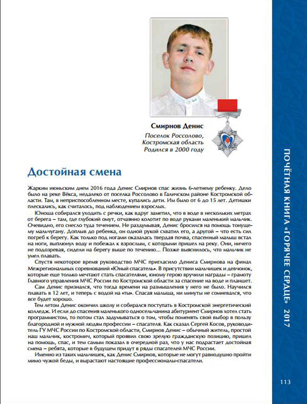 А мы добавим: в Почетной книге «Горячее сердце» за прошлый год уже есть «галичская» страница: там вписано имя жителя Челсмы Дмитрия Игнатьева, который так же, как Денис, не раздумывая, спас две жизни.