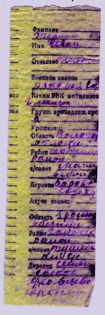 Поисковый отряд «Суворов» нашел в сентябре 2009 года на Невском пятачке Кировского района Ленинградской области останки солдата Великой Отечественной войны Жданова Ивана Николаевича. Останки захоронены 18 сентября 2009 года у мемориала «Невский пятачок». Вместе с останками найден смертный медальон, в котором удалось прочесть: Иван Николаевич ЖДАНОВ родился: Вологодская обл., Тотемский р-н, Маныловский р-н, д.Боровская. Призван на фронт в г. Ленинграде. Семья: Яковлева Аполинария — жена, Ярославская обл., Галичский р-н, Тушебинский с/с, д. Семеновское. В 1944 году Галичский район из Ярославской области был передан в Костромскую. Может, живут еще в Галичском районе или где-то рядом родные солдата. Очень нужно разыскать их, поэтому поисковики просят вашей помощи! Информацию можно отправлять на электронный адрес: http://vk.com/vop35, Марине Морозовой.